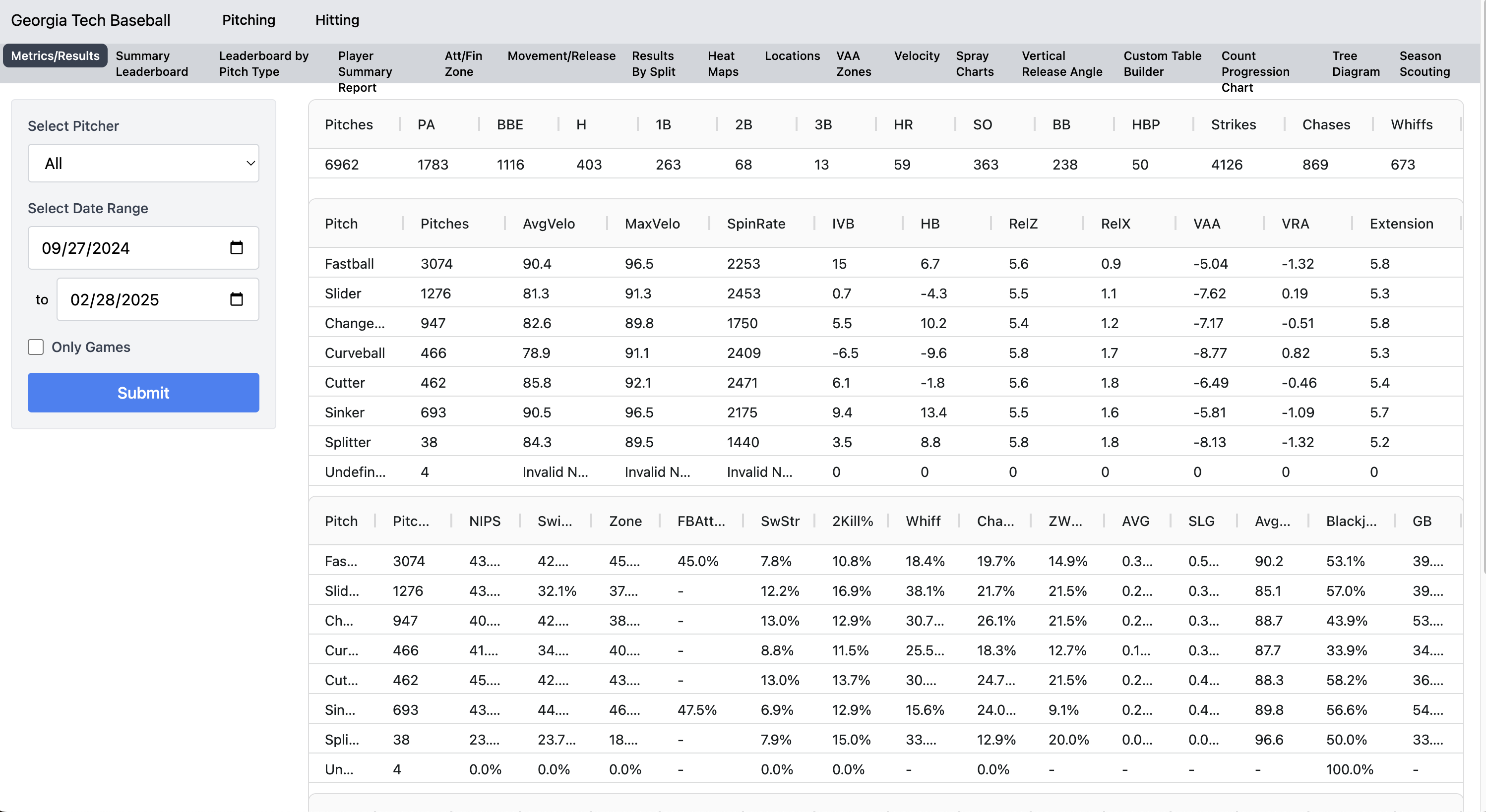 Dashboard that summarizes CSV pitching data for player feedback with 10+ visual charts, 15+ tables. Used daily by Pitching Coaches to review practice sessions