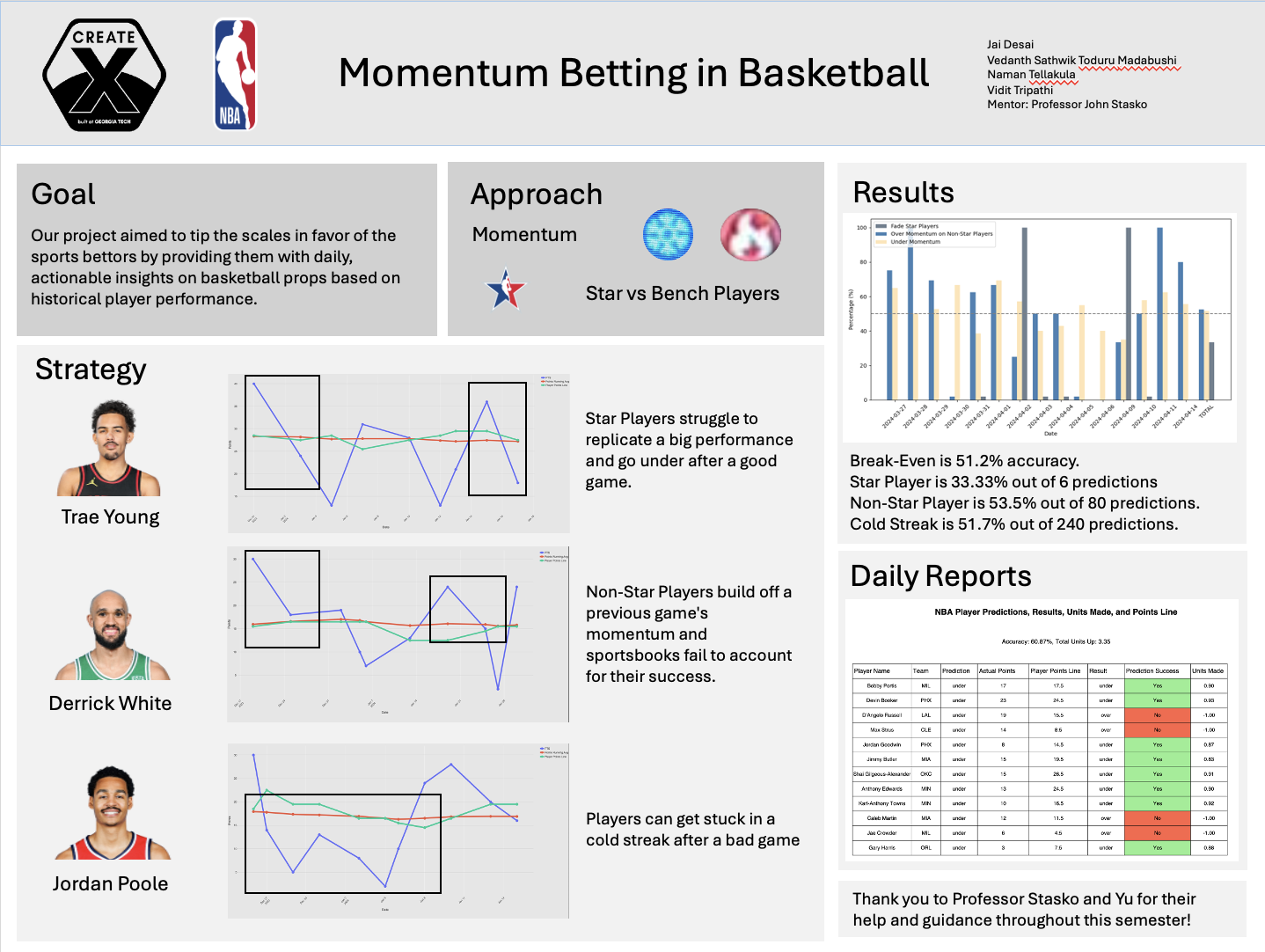 Built NBA player data and odds api pipeline with Pandas, NumPy to collect data, train a regression model and make predictions based on previous games performance, achieving 51.7% success rate - 0.5% edge on sportsbooks.